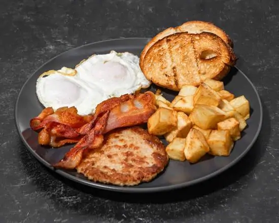 1 Meat, 2 Eggs, option of Cheese & home made Fries